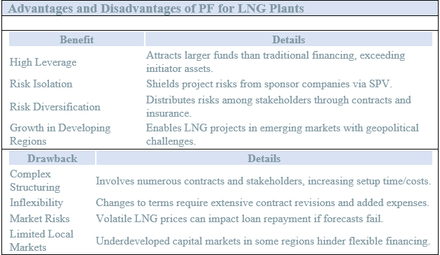 PF for LNG plants involves creating a Special Purpose Vehicle (SPV) to isolate the project and secure funds against future cash flows. This method suits the high capital needs and long timelines of LNG projects, requiring collaboration among banks, companies, and governments to ensure a stable legal and risk framework.